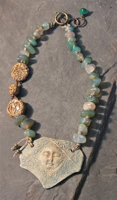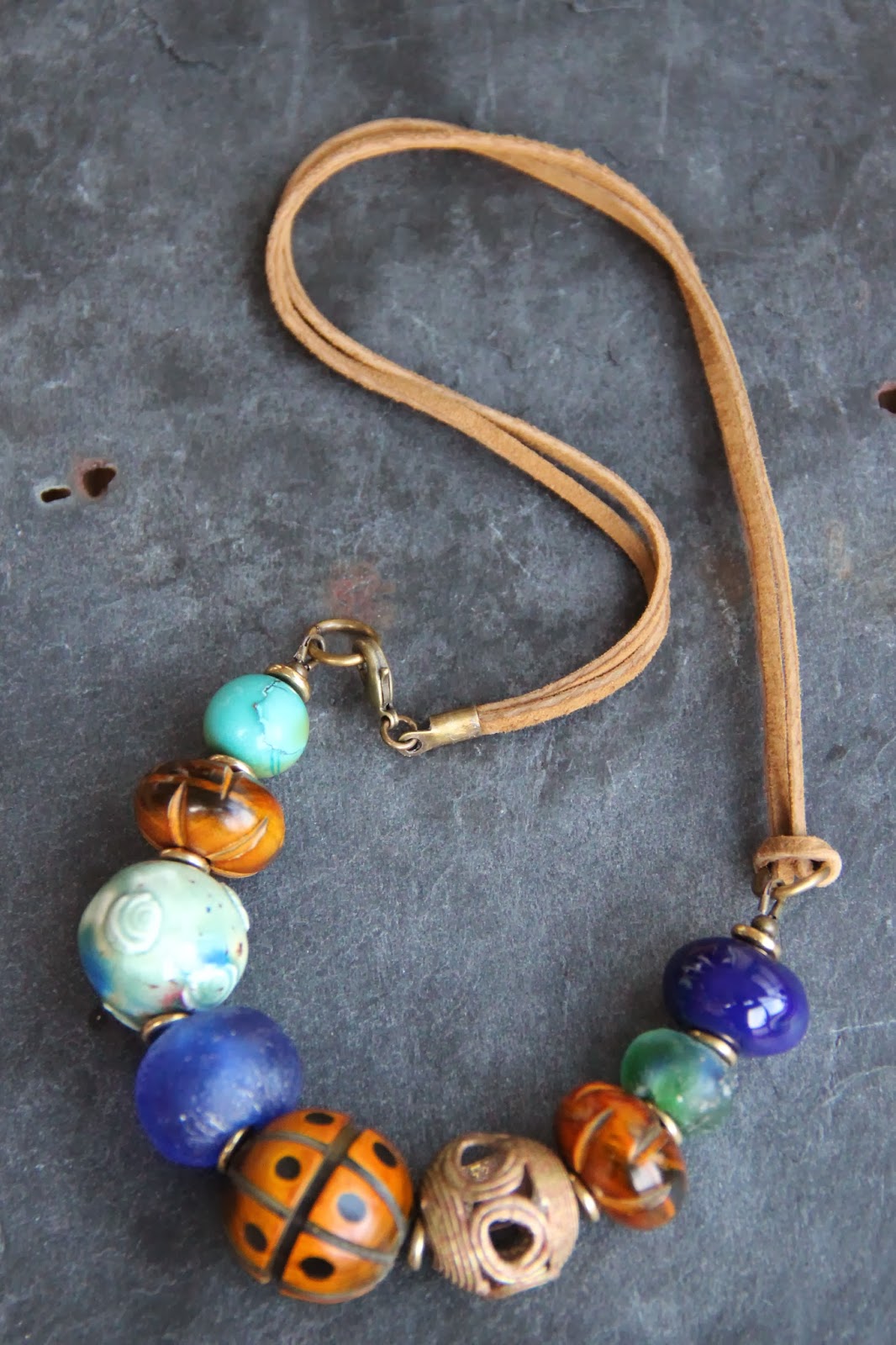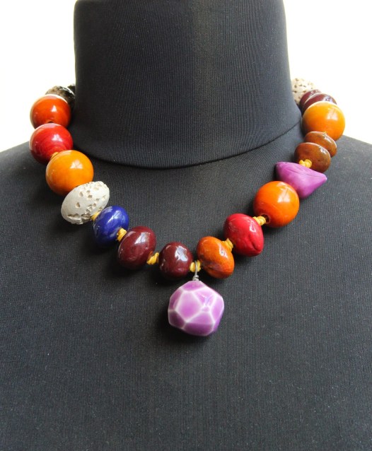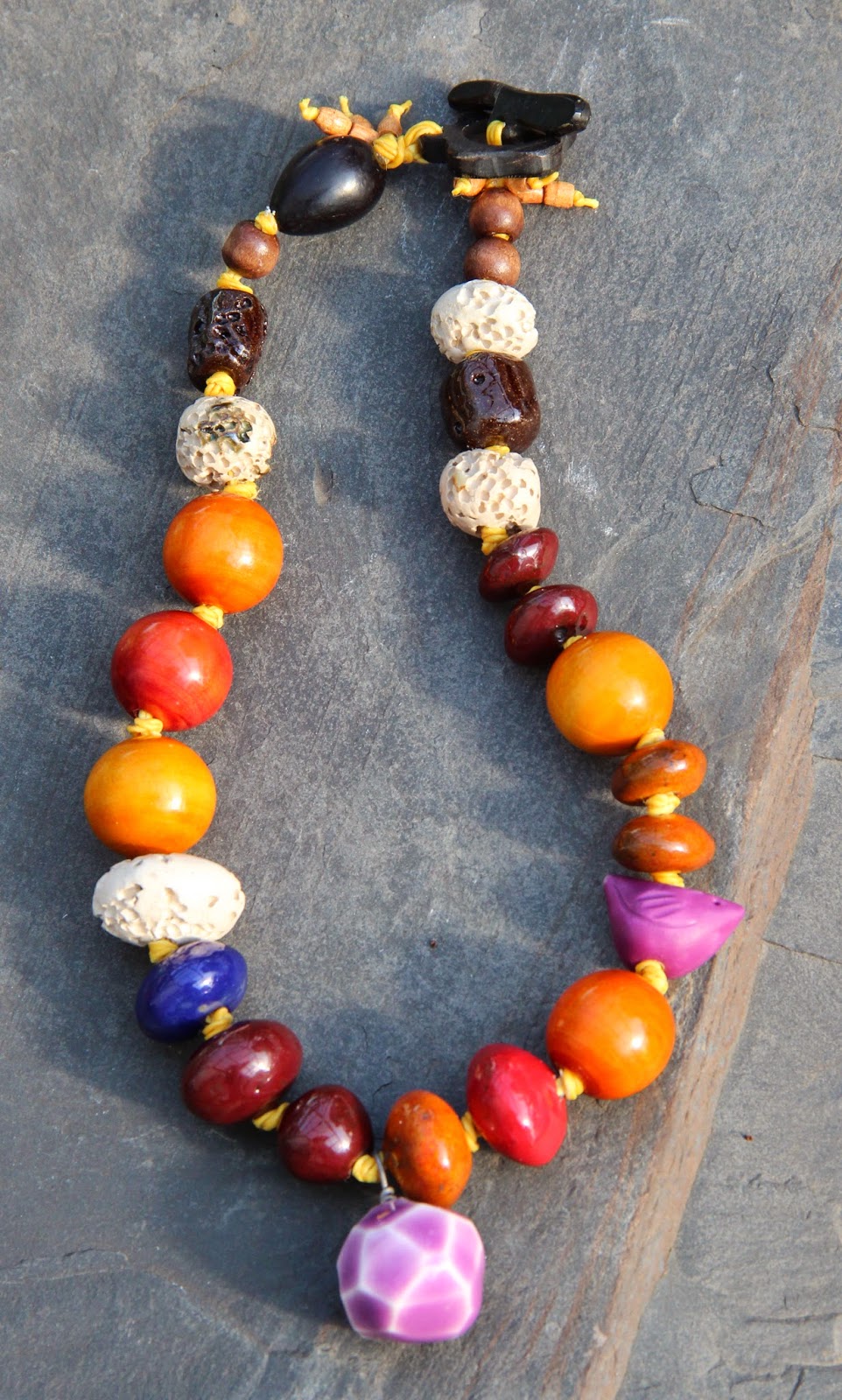 I had gathered beads for a week and I didn’t know how to assemble them. I had tried leather, linen, cotton, knotted or not. There was always something wrong either with the diameter of the cord or of the bead hole. That’s the problem with big beads.
