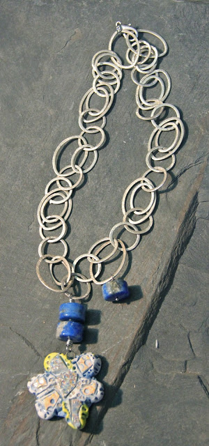 Je suis restée simple, j’ai gardé le pendentif de Mary Harding, ajouté trois pierres, et de la chaîne achetée au Portugal.