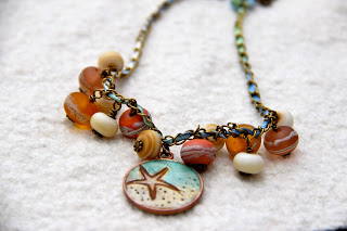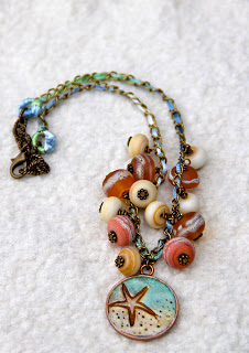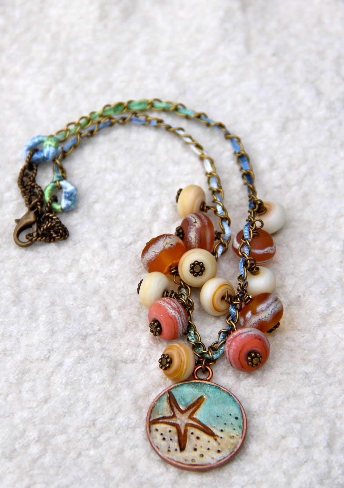Today, I remembered some oblong stone beads in shades of yellow and the rest followed quickly, some jasper beads, landscape and aqua terra, glass beads from Mermaid Glass and ceramic beads from Happy Fallout.