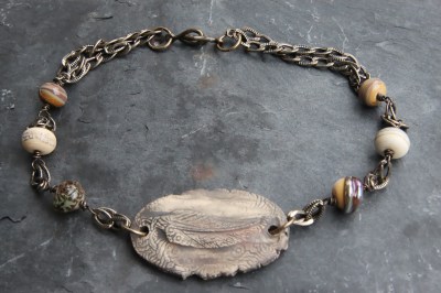 It wasn’t easy at first. I couldn’t figure out how to integrate that flat oblong yellow bead, but then with some wire and waxed linen, this is what I ended up with.