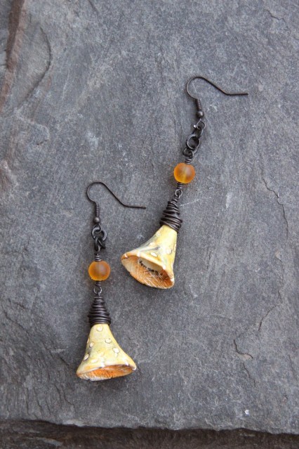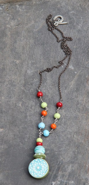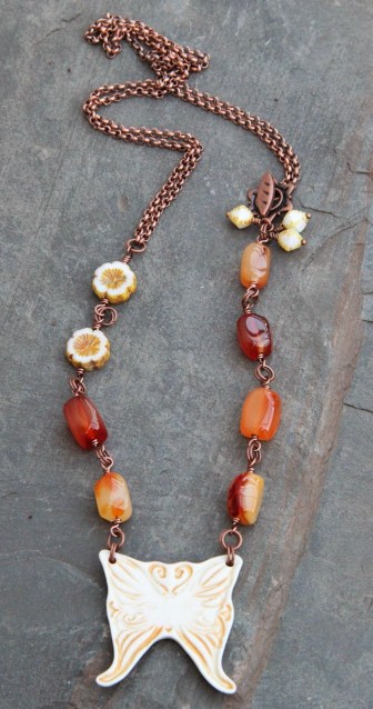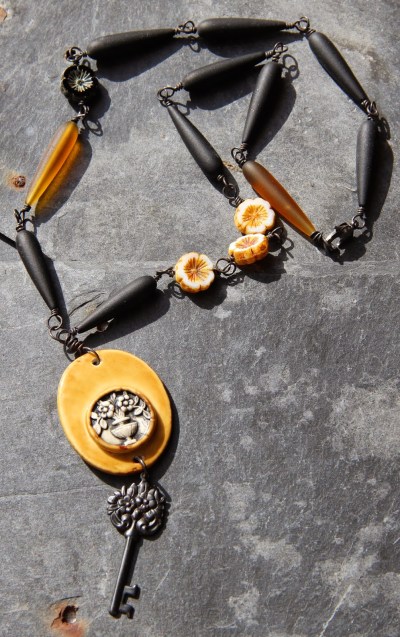 Tout d’abord un coeur, un coeur certes mais rouge, jaune et orange. J’y ai ajouté un oiseau de Pips Jewellery, une perle en cuivre et des coupelles de Lorelei Eurto Jewelry , des perles en bambou corail et des chips de pierre teintée.