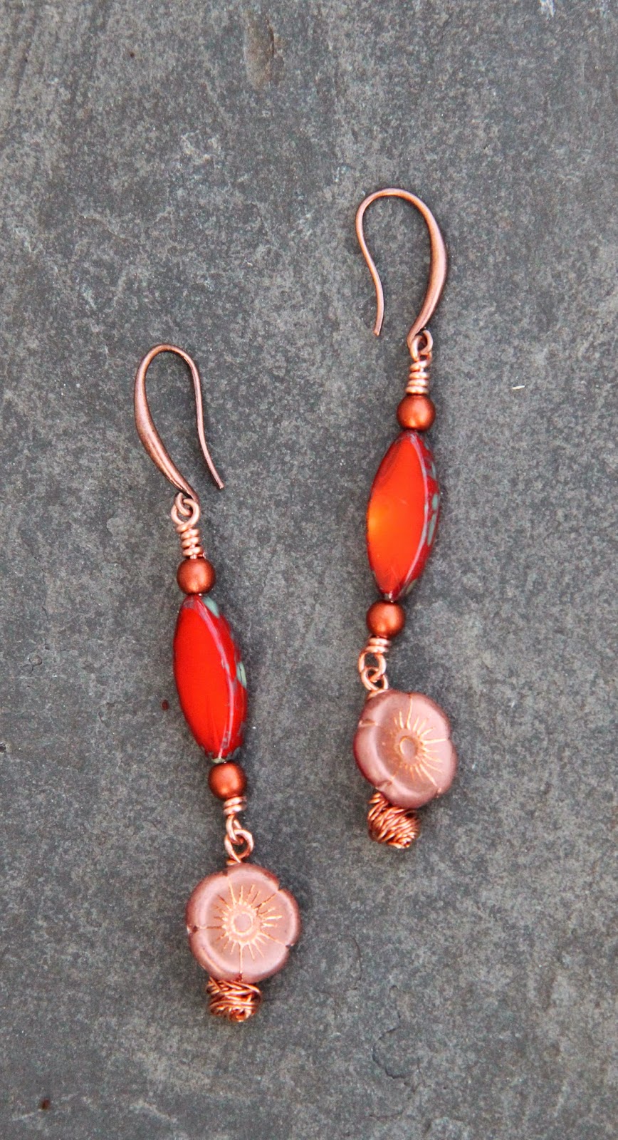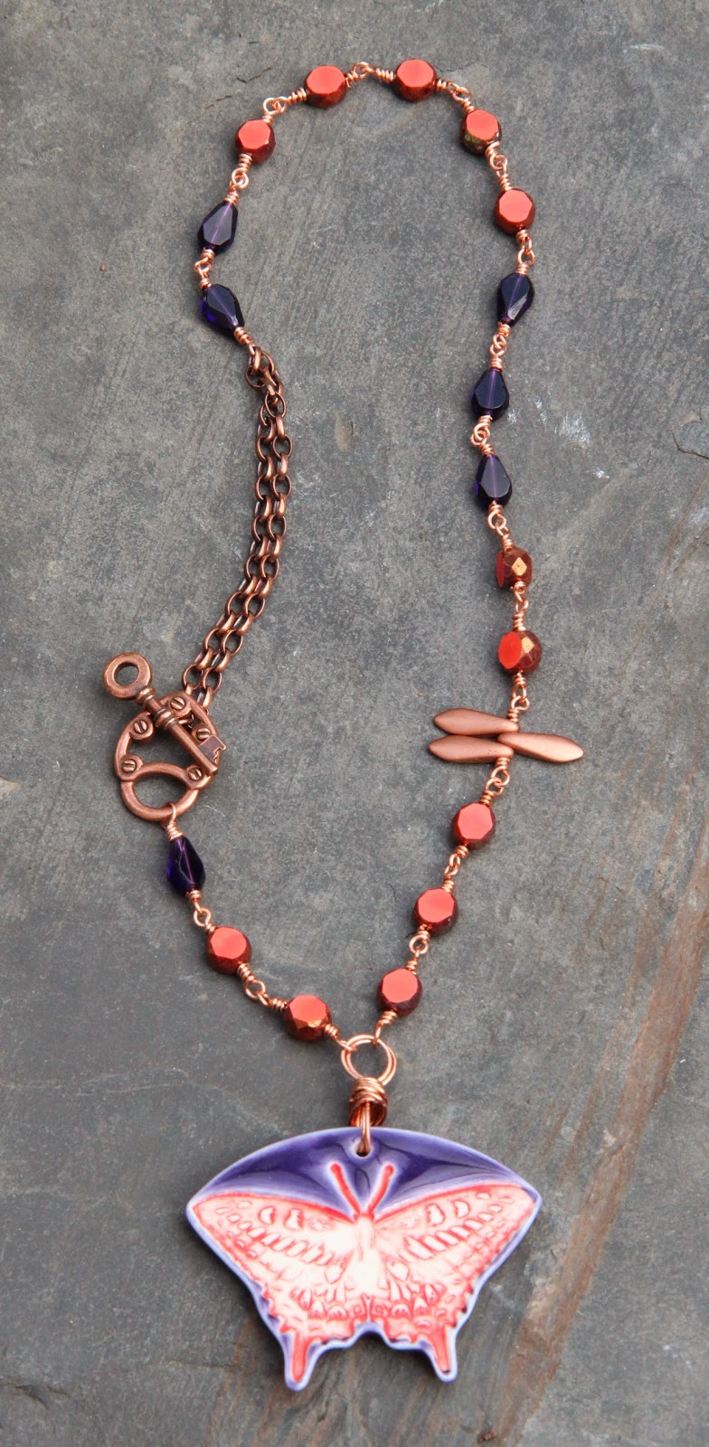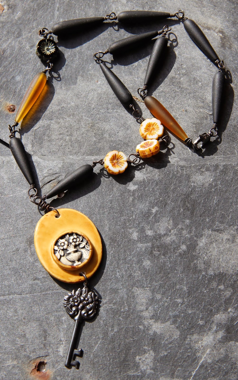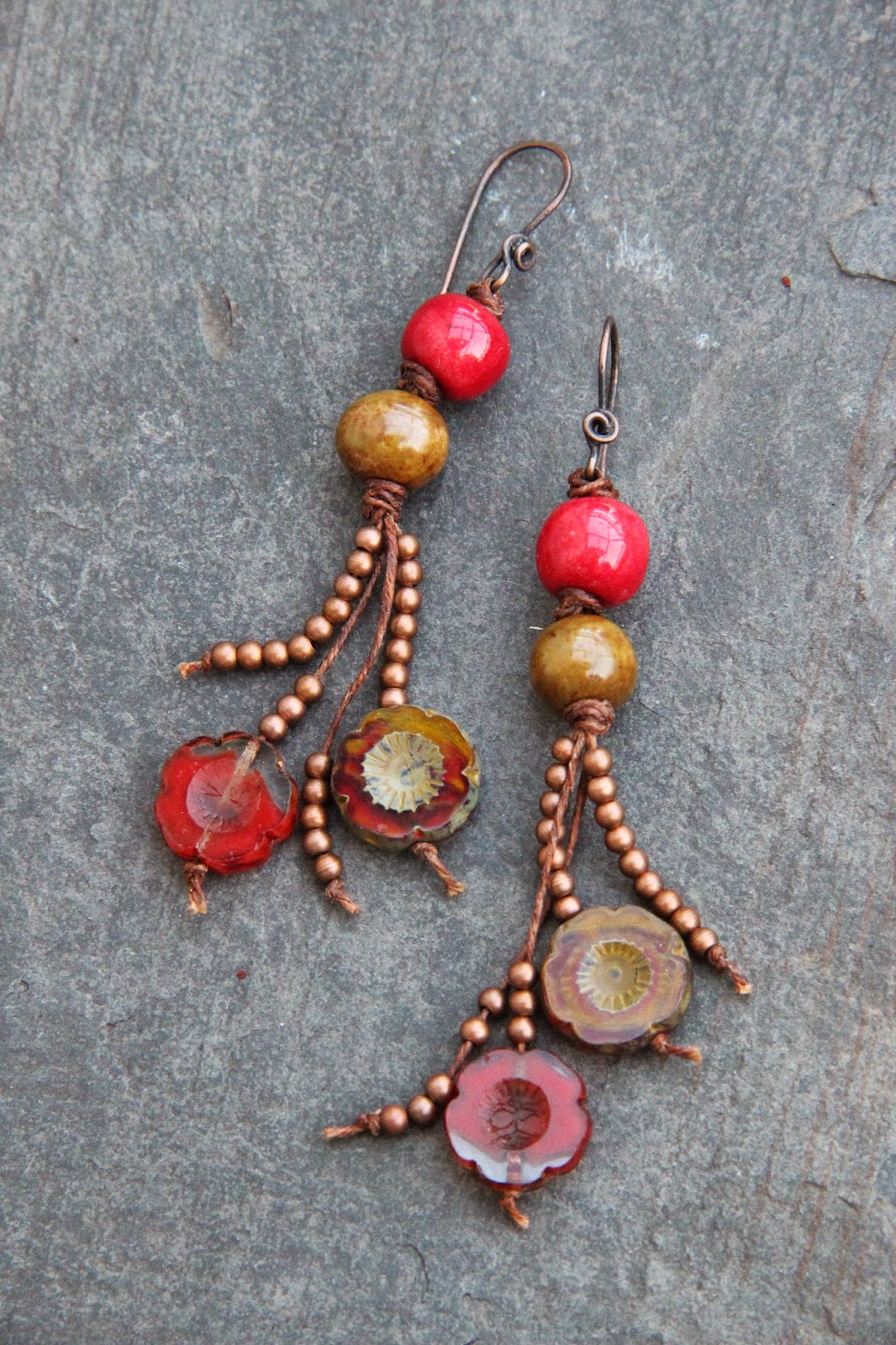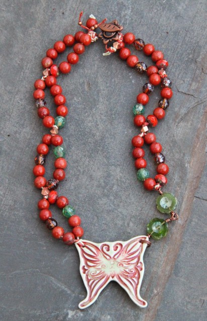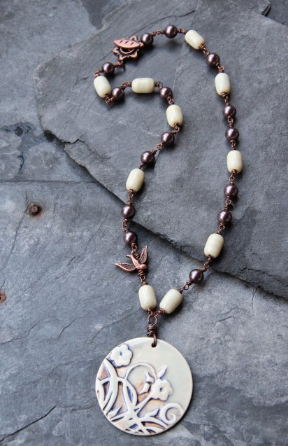First I chose a heart, a heart yes but red, orange and yellow. I added a Pips Jewellery bird, a copper bead, some tin bead caps from Lorelei Eurto Jewelry, coral bamboo and tainted stone chips.