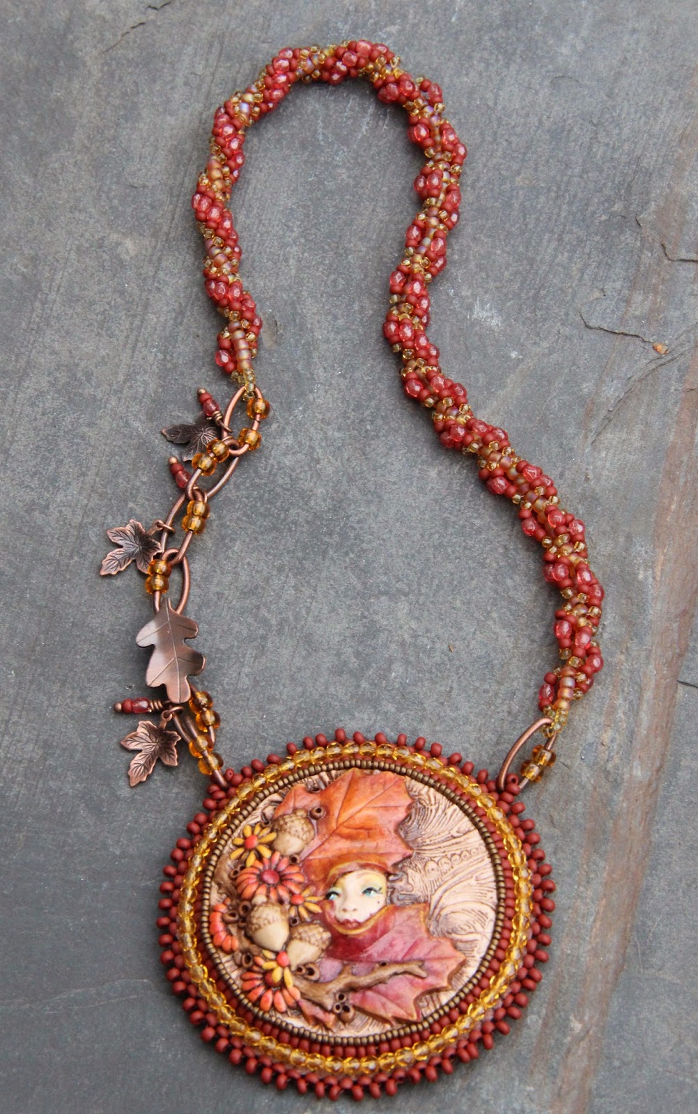 Trois semaines après avoir commencé à broder autour de ce cabochon en pâte polymère sans trop savoir quoi en faire, voici un collier. Au fur et à mesures d’autres perles et un cabochon de chez Majoyoal brodés aux couleurs de l’automne se sont imposés. Les cercles en cuivre et verre sont des tiges que j’avais travaillé pour des boucles d’oreilles. L’une d’elles s’est cassée. Rien ne se perd. Par contre, j’ai pris conscience du temps passé depuis ces boucles d’oreilles faites en mars 2016, le cabochon acheté en septembre 2014 chez Sculpted Windows et maintenant, et comme le plaisir de manier les couleurs m’avait manqué, mais j’y travaille.